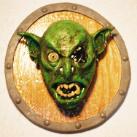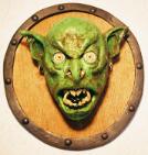 Mounted on a 19" x 16" wooden, circular dwarven shield, these orc hedz scream ferocity. The 14" x 13" head itself is
